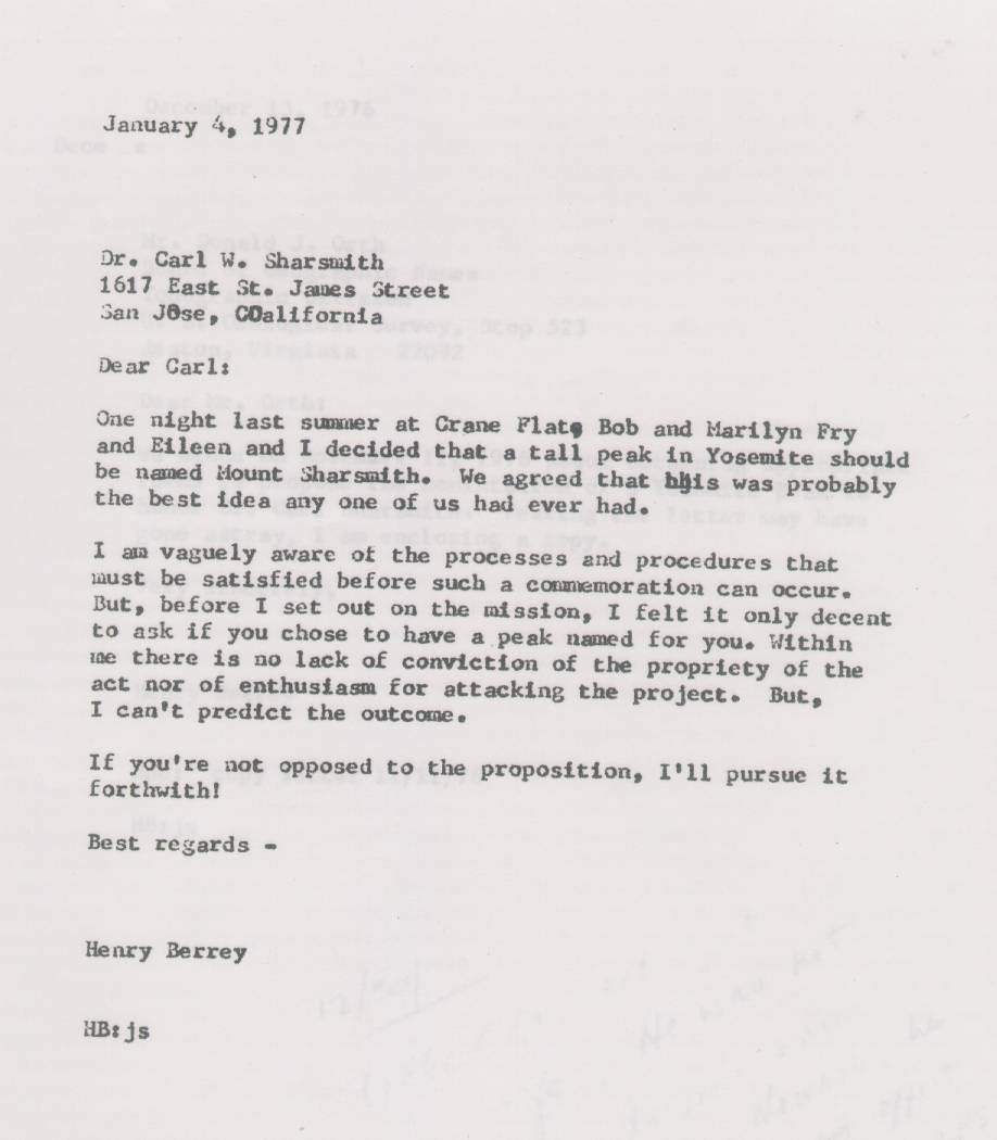 ACTION OF BOARD AT MEETING OF SEPTEMBER 9, 2006: At its annual meeting the Board of Directors of the Yosemite Association endorsed the Sharsmith Peak naming proposal, as confirmed by President Steve Medley. Mr. Medley died not long after, however, and thus a delay occurred until the following letter was prepared.