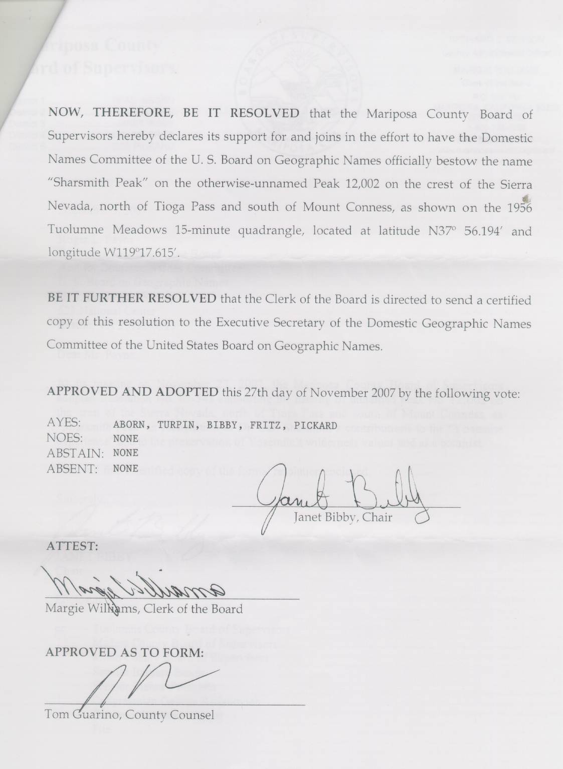 Resolution 07-548 dated November 27, 2007 endorsing official naming of Sharsmith Peak by the U.S. Board on Geographic Names.