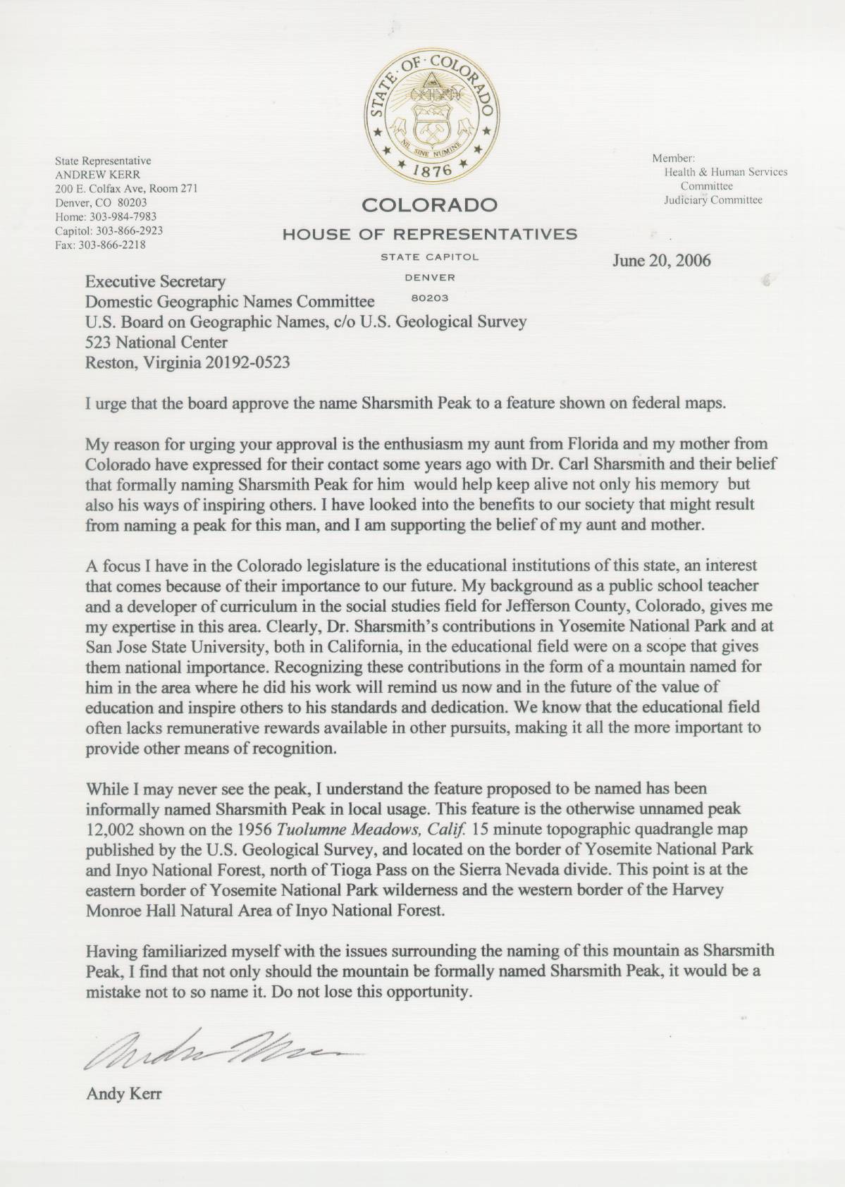 Andy Kerr. Member House of Representatives, State of Colorado. Former teacher and now Curriculum Developer for Jefferson County, Colorado, school district. Based in Lakewood, Colorado.