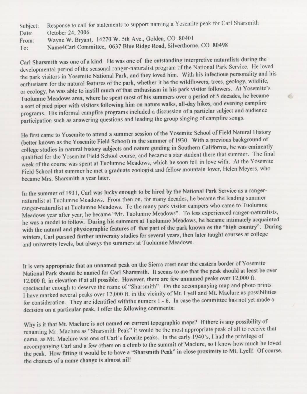 Home & Synopsis/Status Reports Purpose & Method Who was Carl Sharsmith? Why name a Yosemite feature for Carl?/Origin of Proposal Which feature should be named for Carl? How can a feature be named for Carl? SUMMARY OF SUPPORTING STATEMENTS Contacts/Resources Webmaster Search Form