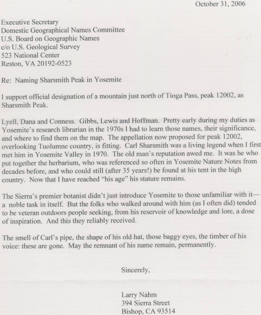 Home & Synopsis/Status Reports Purpose & Method Who was Carl Sharsmith? Why name a Yosemite feature for Carl?/Origin of Proposal Which feature should be named for Carl? How can a feature be named for Carl? SUMMARY OF SUPPORTING STATEMENTS Contacts/Resources Webmaster Search Form