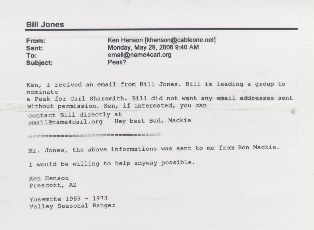 Home & Synopsis/Status Reports Purpose & Method Who was Carl Sharsmith? Why name a Yosemite feature for Carl?/Origin of Proposal Which feature should be named for Carl? How can a feature be named for Carl? SUMMARY OF SUPPORTING STATEMENTS Contacts/Resources Webmaster Search Form