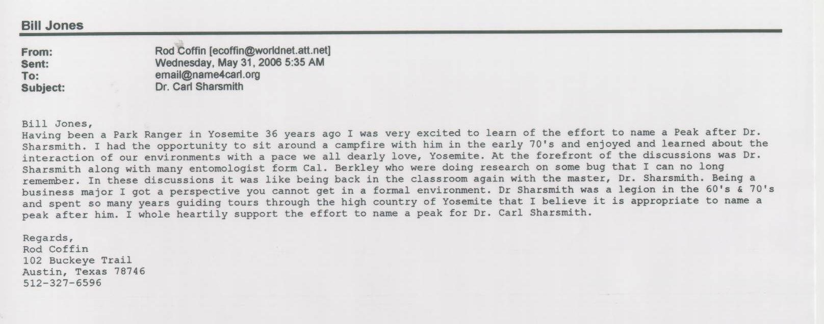 Home & Synopsis/Status Reports Purpose & Method Who was Carl Sharsmith? Why name a Yosemite feature for Carl?/Origin of Proposal Which feature should be named for Carl? How can a feature be named for Carl? SUMMARY OF SUPPORTING STATEMENTS Contacts/Resources Webmaster Search Form