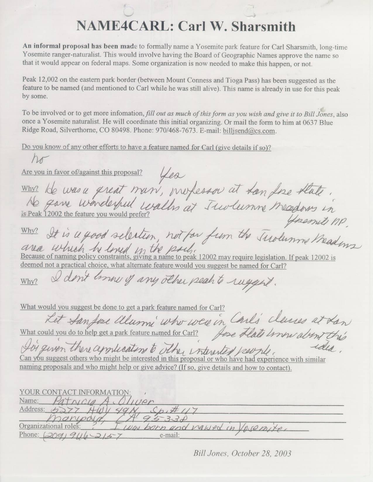 Home & Synopsis/Status Reports   Purpose & Method  Who was Carl Sharsmith?  Why name a Yosemite feature for Carl?/Origin of Proposal   Which feature should be named for Carl?   How can a feature be named for Carl?  SUMMARY OF SUPPORTING STATEMENTS   Contacts/Resources Webmaster  Search Form