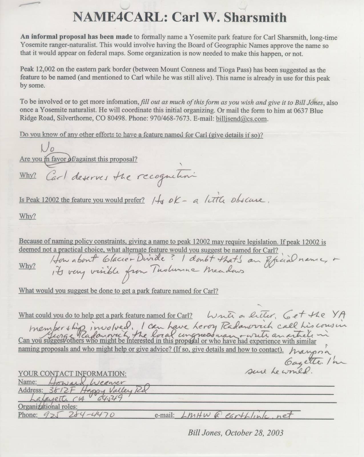 Home & Synopsis/Status Reports   Purpose & Method  Who was Carl Sharsmith?  Why name a Yosemite feature for Carl?/Origin of Proposal   Which feature should be named for Carl?   How can a feature be named for Carl?   SUMMARY OF SUPPORTING STATEMENTS   Contacts/Resources Webmaster Search Form