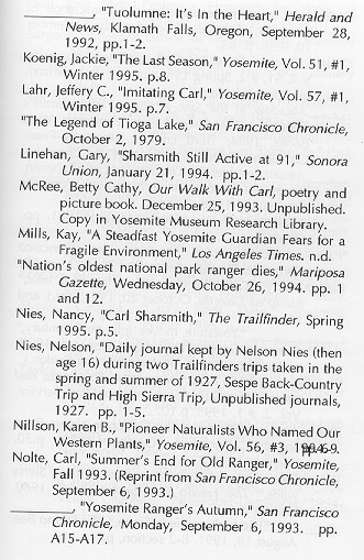 Pages below are from Sharsmith, John and Shields, Allan, 1996, Climb Every Mountain: A Portrait of Carl Sharsmith. Jerseydale Ranch Press: Mariposa, CA. Pages xiv-xxiv. Permission to reproduce this bibliography on the website name4carl.org received from Allan Shields, 4/20/06.