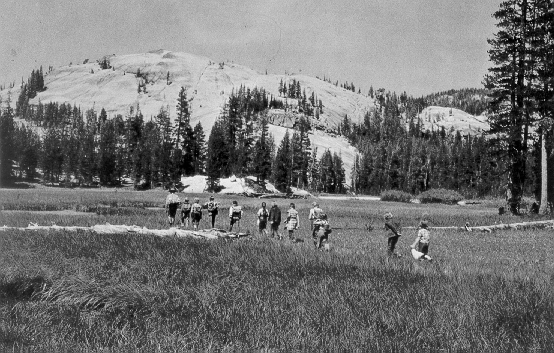 Ranger-naturalist Carl leads a children's nature walk across Tuolumne Meadows, circa 1950s, Photo by Douglass Hubbard from Hello World: A National Park Adventure by Fran Hubbard.