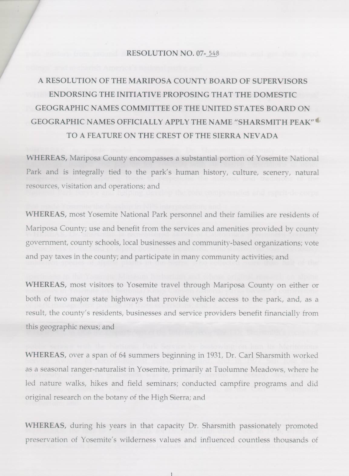 Resolution 07-548 dated November 27, 2007 endorsing official naming of Sharsmith Peak by the U.S. Board on Geographic Names.