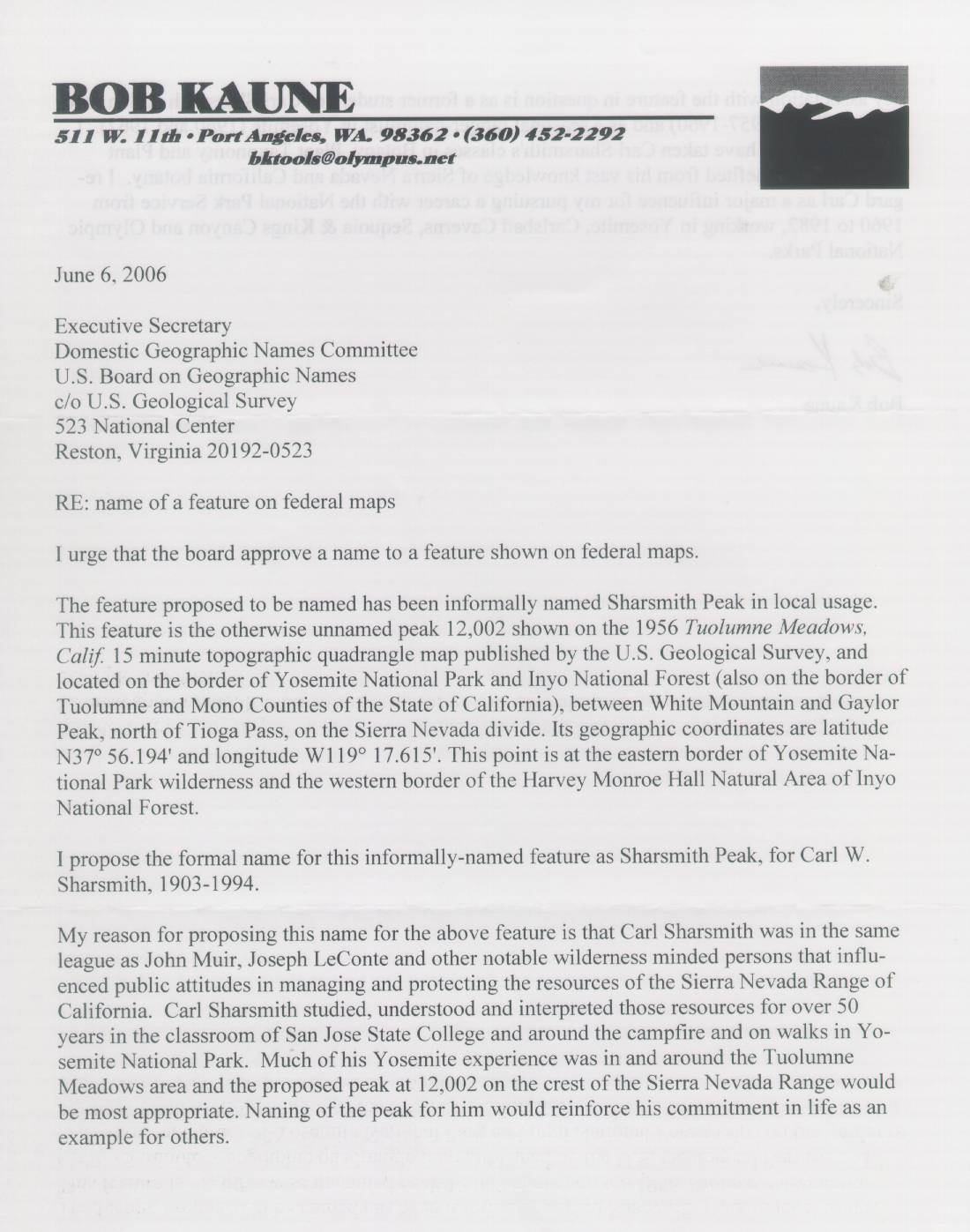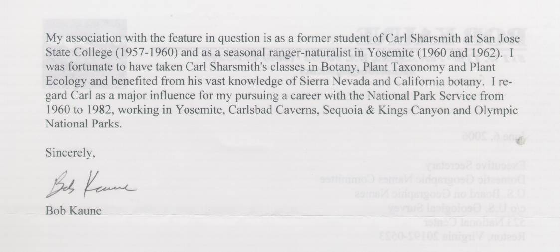 Home & Synopsis/Status Reports   Purpose & Method  Who was Carl Sharsmith?  Why name a Yosemite feature for Carl?/Origin of Proposal   Which feature should be named for Carl?  How can a feature be named for Carl?  SUMMARY OF SUPPORTING STATEMENTS   Contacts/Resources Webmaster Search Form
