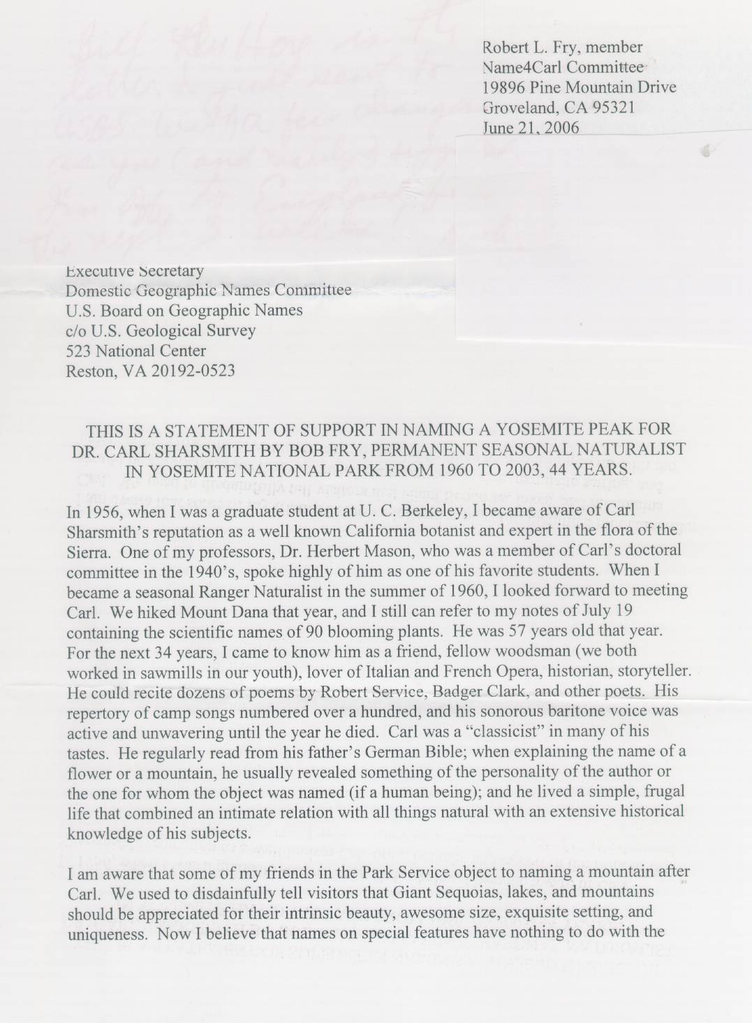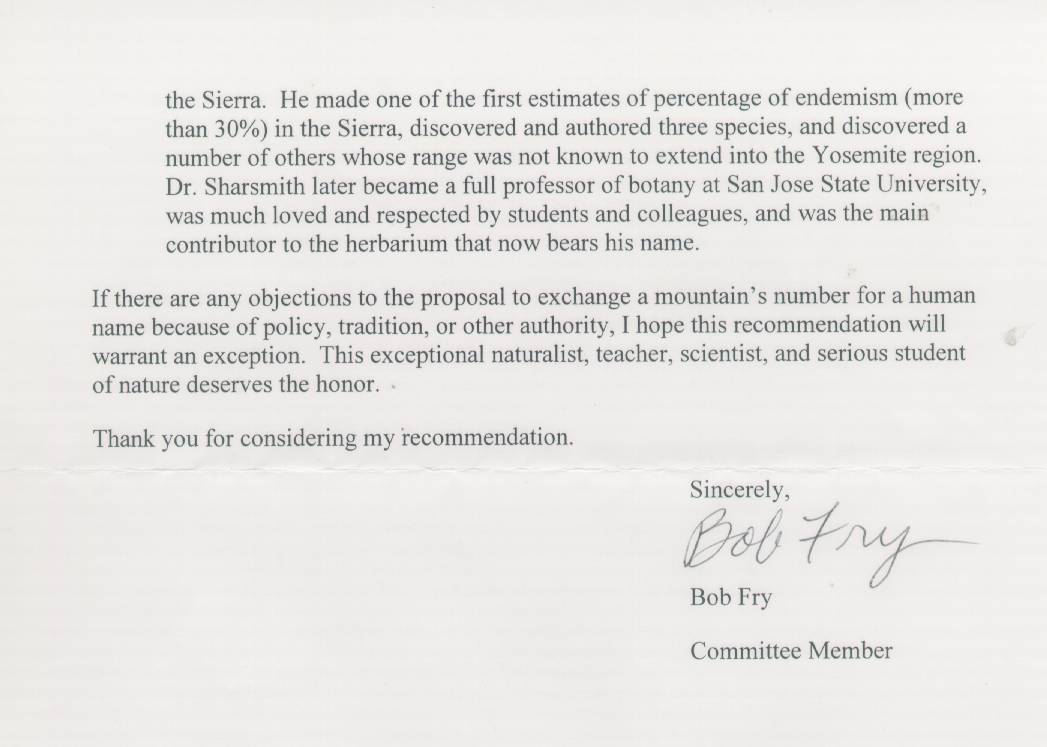 Bob Fry, Yosemite National Park park naturalist 1960-circa 2003, Yosemite Field Seminars botany and ethnobotany and ethnography instructor; educator. Bob has had contact with the proposal to name a mountain for Carl since 1976. Based in Groveland, California.