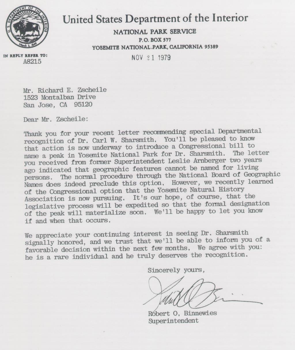 Home & Synopsis/Status Reports   Purpose & Method  Who was Carl Sharsmith?  Why name a Yosemite feature for Carl?/Origin of Proposal   Which feature should be named for Carl?  How can a feature be named for Carl?  SUMMARY OF SUPPORTING STATEMENTS   Contacts/Resources Webmaster Search Form