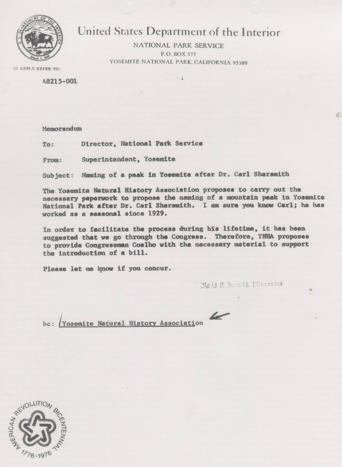Leslie Arnberger, deceased, former Superintendent, Yosemite National Park, former superintendent Cape Cod and Point Reyes National Seashores.