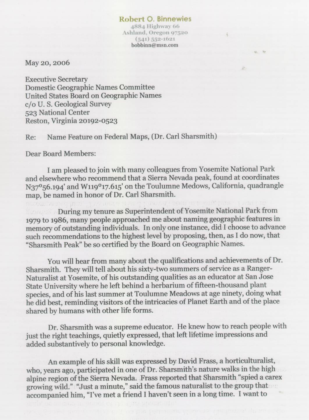 Home & Synopsis/Status Reports Purpose & Method Who was Carl Sharsmith? Why name a Yosemite feature for Carl?/Origin of Proposal Which feature should be named for Carl? How can a feature be named for Carl? SUMMARY OF SUPPORTING STATEMENTS Contacts/Resources Webmaster Search Form