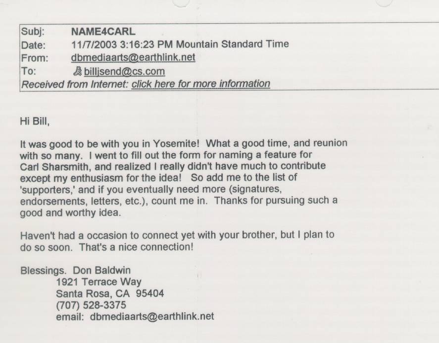 Home & Synopsis/Status Reports   Purpose & Method  Who was Carl Sharsmith?  Why name a Yosemite feature for Carl?/Origin of Proposal   Which feature should be named for Carl?    SUMMARY OF SUPPORTING STATEMENTS  How can a feature be named for Carl?    Contacts/Resources Webmaster