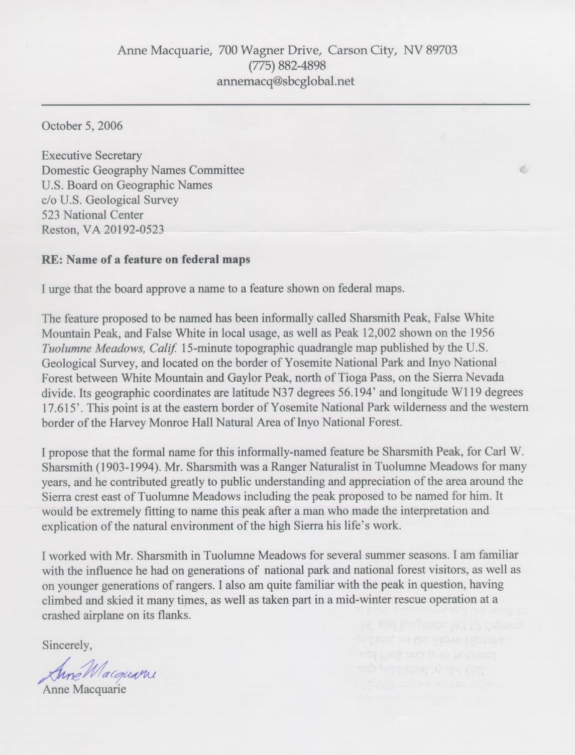 Anne Woessner Macquarie. Anne is a world mountaineer and author who grew up in Yosemite Valley. She was summer and winter ranger at Tuolumne Meadows and participated 25 years ago in a search and rescue operation for a downed plane on the proposed Sharsmith Peak, retrieving 5-year old Donnie Priest who survived 5 days in the snow-covered fuselage. Anne is now based in Carson City, Nevada.