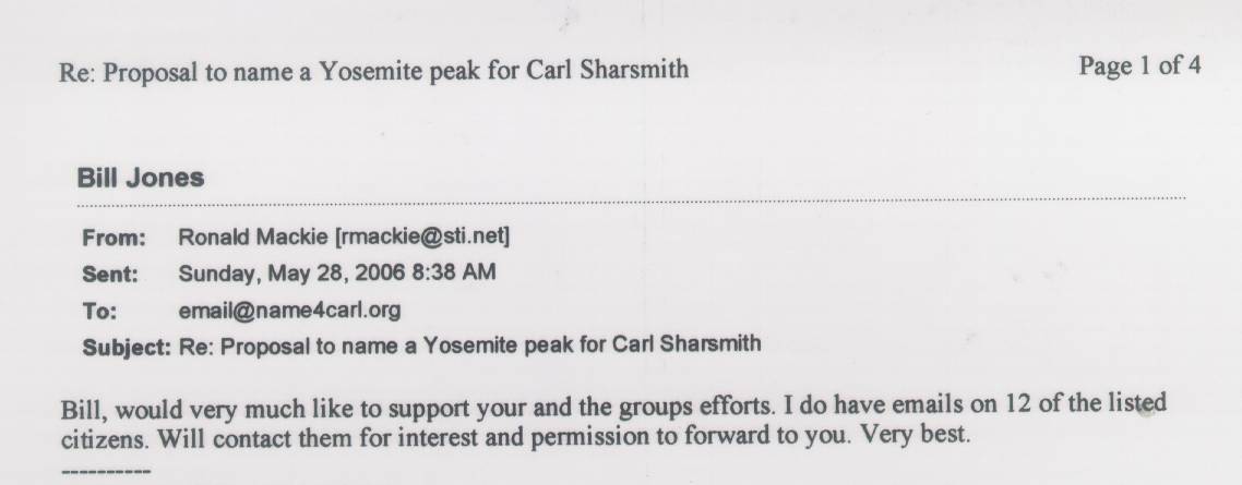 Home & Synopsis/Status Reports   Purpose & Method  Who was Carl Sharsmith?  Why name a Yosemite feature for Carl?/Origin of Proposal   Which feature should be named for Carl?   How can a feature be named for Carl?  SUMMARY OF SUPPORTING STATEMENTS    Contacts/Resources Webmaster  Search Form