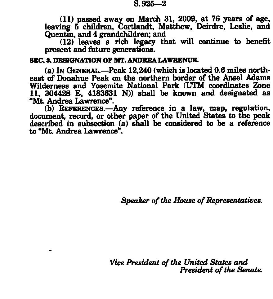 Legislative History of Mt. Andrea Lawrence Designation Act
